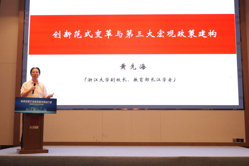 黄先海教授作了题为《“创新范式变革与第三大宏观政策建构”》的报告。黄先海副校长基于对“杭州创新迸发现象” 的深入调查和学理探究,提出了支撑杭州创新迸发现象的背后是创新道路的重大跃迁,突出表现为“一范式三机制”,其中“一范式”指的是创新范式的大变革,“三机制”指的是青年创新主角机制、“双赋能仓”机制、“双前沿”机制。基于上述范式变革与机制的提出,黄先海副校长进一步提出了构建创新增长导向的“第三大宏观政策”的重大理论主张,其是推动生产函数的“跃迁效应”,并通过培育新质生产力,实现经济结构和内容的迭代升级,从根本上塑造新动能以走出危机。